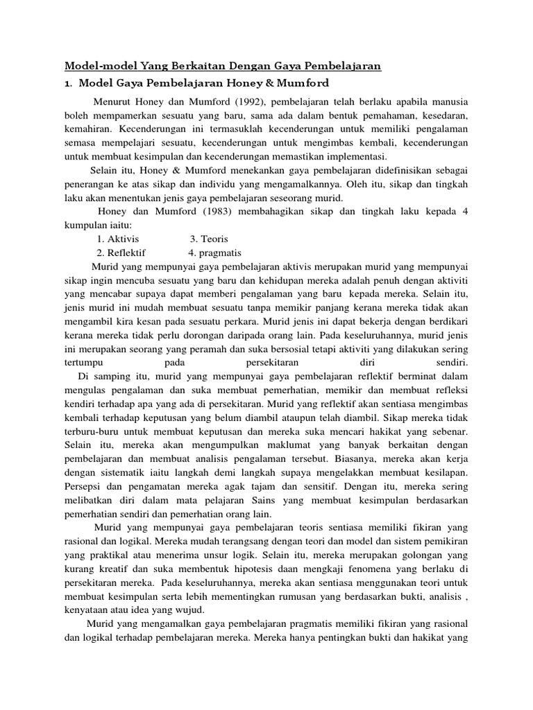 Dr tiong leh ling jabatan ilmu pendidikan ipg kampus rajang gaya pembelajaran = cara bgmn sorg murid mberi fokus, mproses gp boleh bubah mgikut masa. Hubungan diantara gaya pembelajaran dengan pencapaian akademik pelajar sarjana muda teknologi serta pendidikan di utm dalam mata pelajaran teknologi pengeluaran asas. Xiv, senarai simbol singkatan tatanama istilah, ipda institut pendidikan darul aman. Pelajar perlu menggunakan pelbagai model dan teknik pembelajaran. Model gaya pembelajaran honey & mumford.