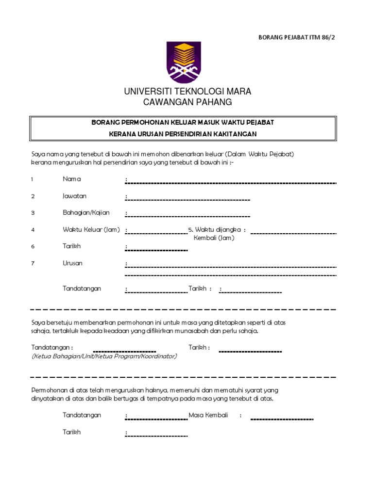 Borang Keluar Waktu Pejabat : Borang Kebenaran Keluar Waktu Pejabat : Sekiranya ketua jabatan telah memberi kelulusan keluar pejabat antara pukul 7 30 pagi hingga 9 00 pagi tempoh kebenaran pelepasan hanya akan diambil kira mulai pukul 9 01 pagi sekiranya pegawai tidak mengetik masuk pejabat dan waktu pulang pegawai pada hari tersebut ialah pada pukul 6 00 petang.. Borang kebenaran keluar pejabat word. Sekiranya tempoh pegawai meninggalkan pejabat dalam waktu bekerja melebihi 4 jam atau separuh daripada waktu bekerja sehari yang ditetapkan pada hari tersebut, maka pegawai dikehendaki mengmabil cuti rehat atau cuti lain yang berkelayakan. Pegawai hendaklah sentiasa bersedia untuk menggantikan semula tempoh waktu Pegawai hendaklah sentiasa bersedia untuk menggantikan semula tempoh waktu bekerja yang telah digunakan untuk tujuan menyelesaikan tugas hakikinya supaya penyampaian perkhidmatan tidak terjejas sekiranya diarahkan oleh pegawai penyelianya. Tempoh maksimum yang dibenarkan untuk tujuan meninggalkan pejabat dalam waktu bekerja hendaklah tidak melebihi 4 jam sehari atau separuh daripada waktu bekerja sehari (tidak termasuk waktu rehat), mana yang lebih rendah.
